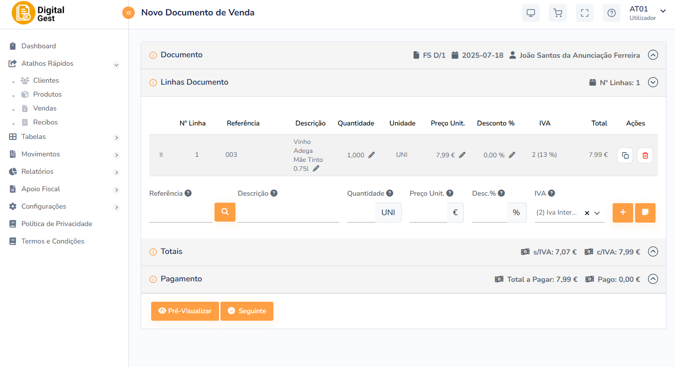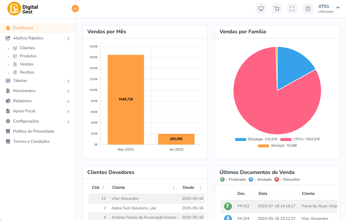 Certificado pela Autoridade Tributária, com suporte a mecanismos obrigatórios como o ficheiro SAF-T(PT), código QR e comunicação eletrónica de documentos.